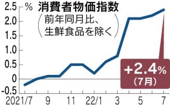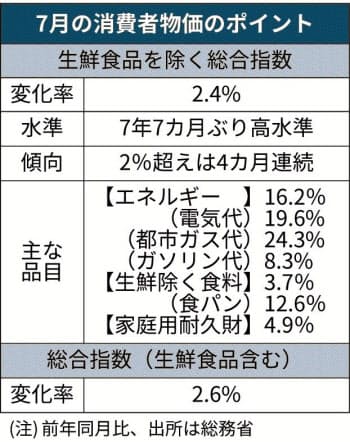 総務省が19日発表した7月の消費者物価指数(CPI、2020年=100)は変動の大きい生鮮食品を除く総合指数が102.2となり、前年同月比2.4%上昇した。消費増税の影響があった14年12月(2.5%)以来、7年7カ月ぶりの上昇率で、4カ月連続で2%台となった。資源高や円安でエネルギーと食料品の上昇が続いている。